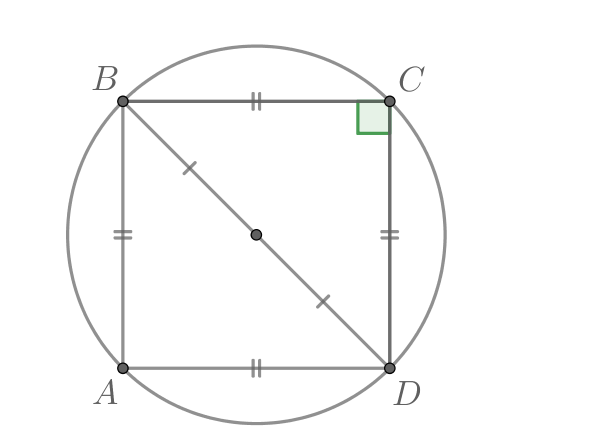 Шаг 1. В квадрате все углы равны $90°$. Угол $\angle BCD = 90°$ — вписанный угол, опирающийся на сторону $BD$. По свойству вписанного угла, если вписанный угол равен $90°$, то сторона, на которую он опирается, является диаметром окружности:
