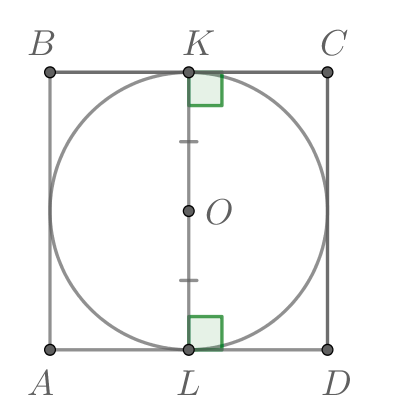 Шаг 1. Пусть $ABCD$ — квадрат, $O$ — центр вписанной окружности радиуса $r = 9$. Точки $K$ и $L$ — точки касания окружности со сторонами $BC$ и $AD$.