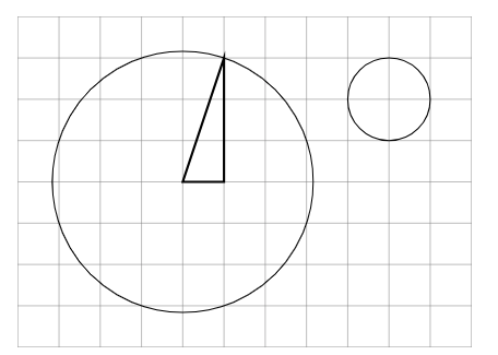 Шаг 1. Построим на клетчатой бумаге прямоугольный треугольник с катетами длиной $3$ и $1$, гипотенуза которого совпадает с радиусом большего круга.